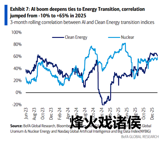 然而,研报称,市场正在迅速意识到这种联系。清洁能源与AI的相关性在一年内从-10%飙升至65%。