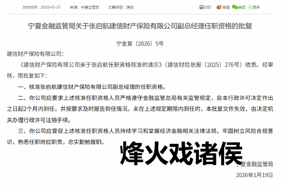 1月21日金融一线消息,宁夏金融监管局发布关于张启航建信财产保险有限公司副总经理任职资格的批复,九游娱乐app核准张启航建信财产保险有限公司副总经理的任职资格。